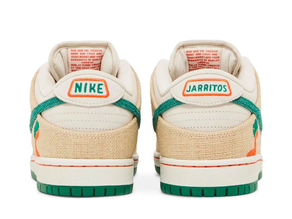 The Nike SB Dunk Low Jarritos showcases a collaborative design inspired by the popular Mexican soda brand. The upper combines a Phantom white leather base with hemp canvas overlays and a Malachite green textile Swoosh. The Jarritos logo is embroidered in green and orange on the lateral heel, while dual branding embellishes the woven tongue tag. Mismatched heel tabs are emblazoned with 'Nike' and 'Jarritos' across the left and right shoe. Anchoring the sneaker is a durable rubber cupsole that pairs white sidewalls with a two-tone green and orange outsole.